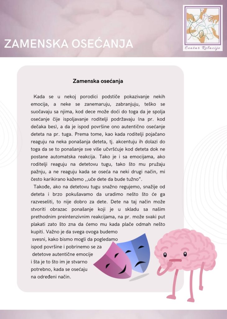 Poslednjih godina suočavamo se sa velikim brojem informacija (u knjigama, tekstovima, na stranicama, različitim seminarima, programima, podkastovima i sl.) za roditelje na koji način treba da odgajaju svoju decu. To je sa jedne strane, a sa druge strane je prisutna odsutnost roditelja zbog brzine života i velikog broja obaveza, pa ta znanja ne stižu da primene i teško im je da se emocionalno povežu sa decom, a deca se osećaju sve usamljenije. Kada pitamo roditelje kako se osećaju najveći procenat odgovara umorno, pod stresom, stalnim pritiskom i sl. To nisu osećanja. Pre bavljenja emocijama dece, značajno je pitanje šta je sa osećanjima roditelja. Zbog toga smo odlučile da celu jednu tematsku celinu našeg E-BOOKa posvetimo upravo osećanjima dece i roditelja. Da bi roditelji mogli emocionalno da se povežu sa decom i da se pobrinu za njihove emocije, važno je da se brinu i o sopstvenim osećanjima.